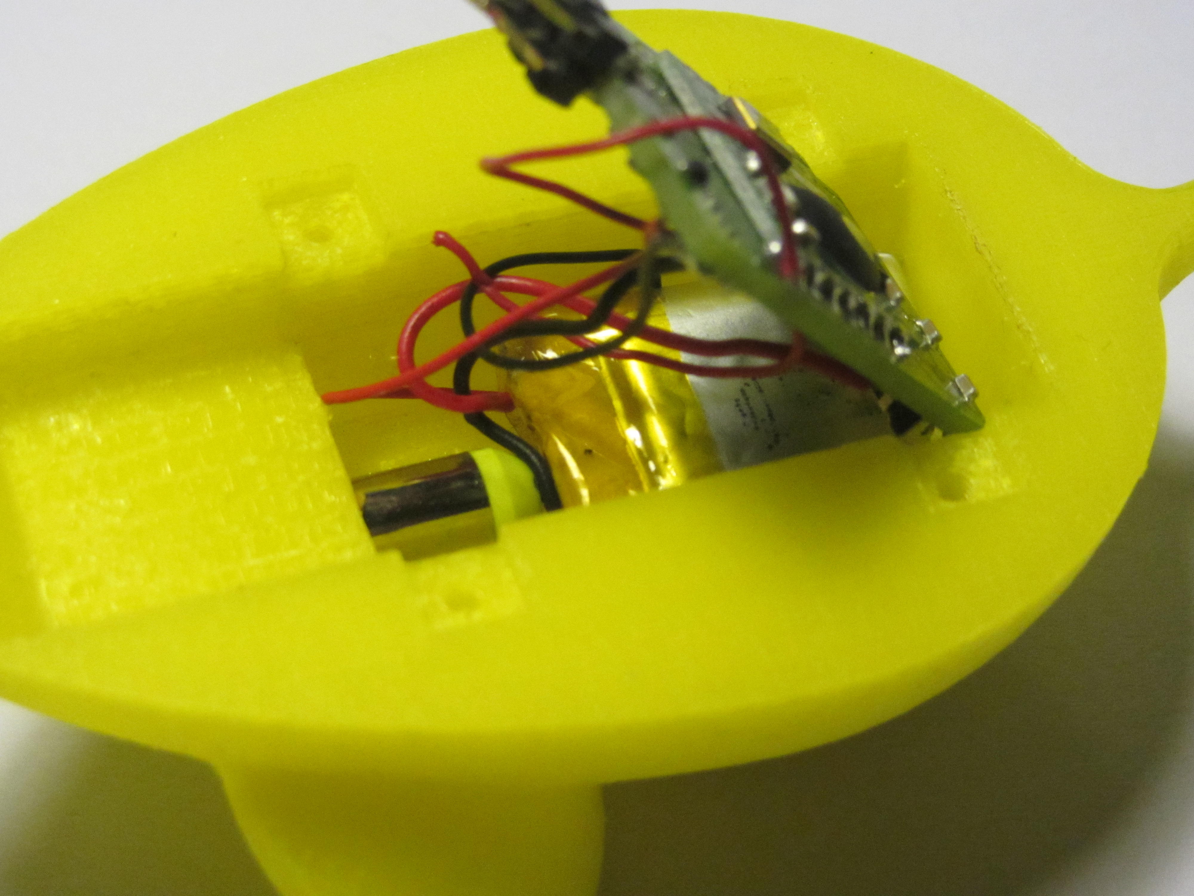 There are more interesting use cases for vibration motors. In this example a 3D printed mouse is equipped with the body interaction pcb board. The vibration makes the mouse moving. The mouse even manages to pass obstacles.