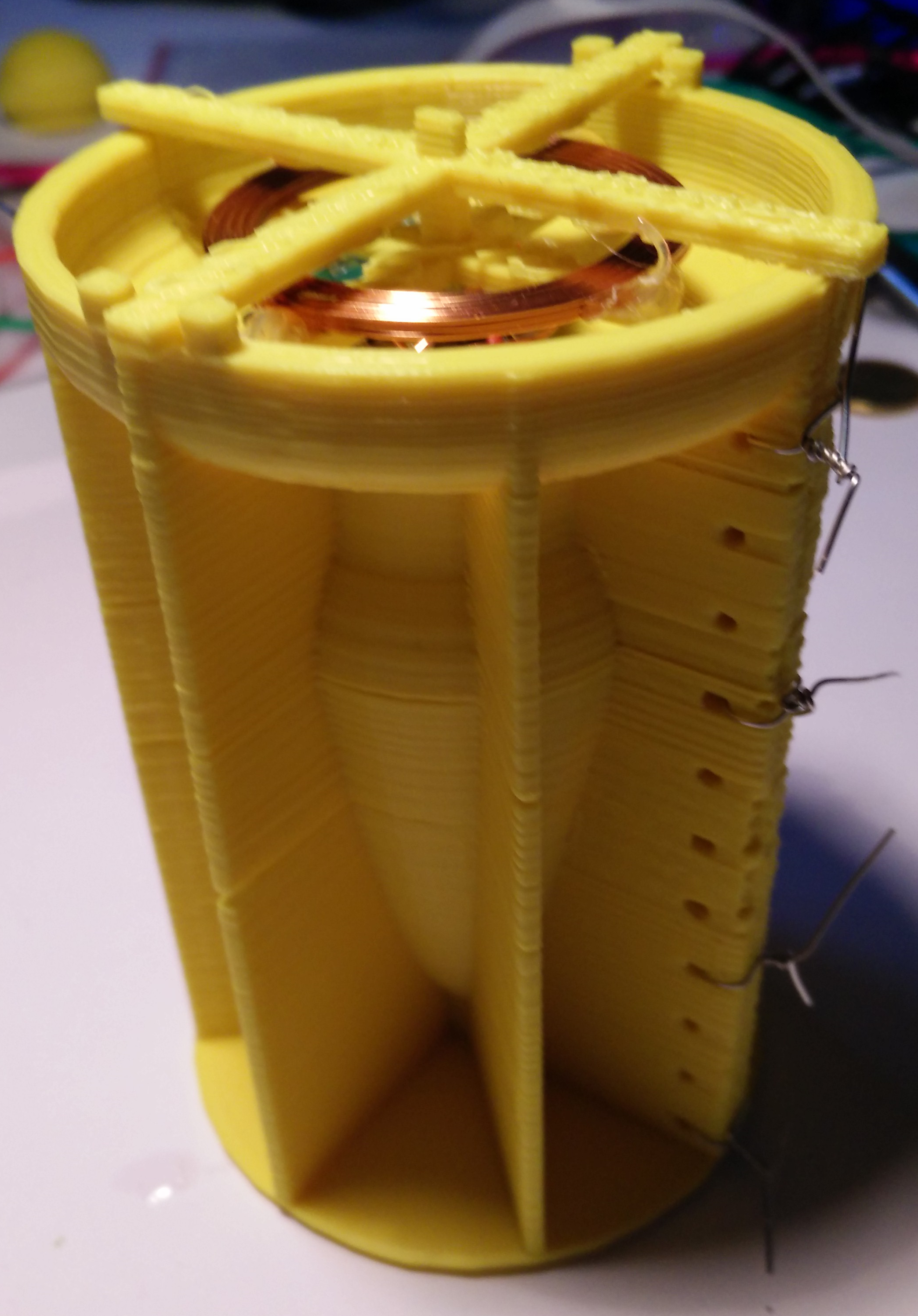 F. Put together both parts of the molding form. Use tinkering wire to attach both parts tight together. Then insert the enclosure into the form. Check the wireless charging function. The yellow LED must be on when you place the charging coil over the receiver coil.