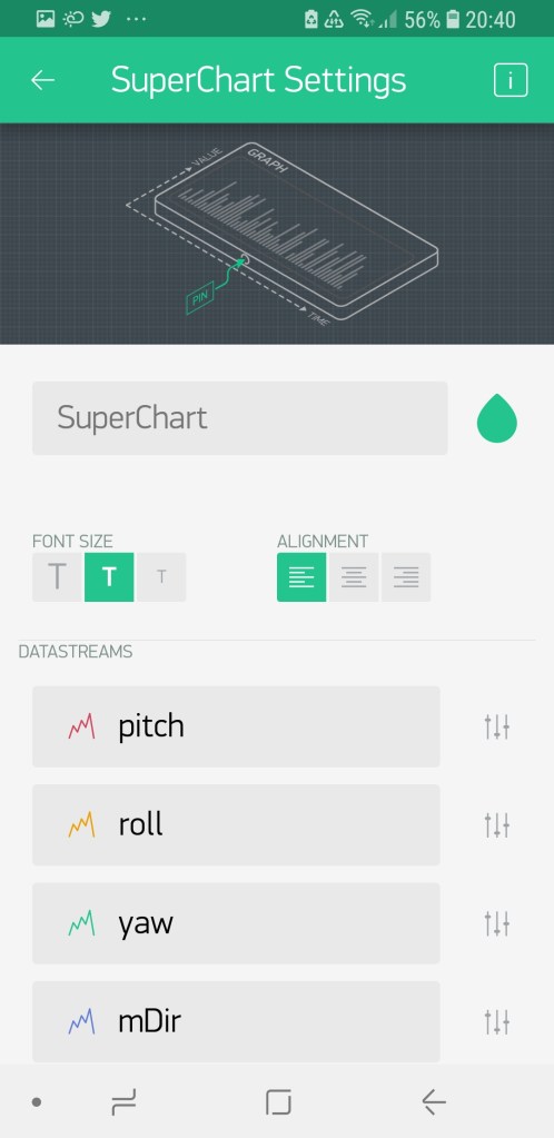 Now the data are continously sent to the Blynk app. To visualize the data we add the widget SuperChart.