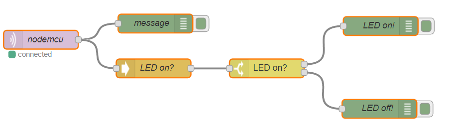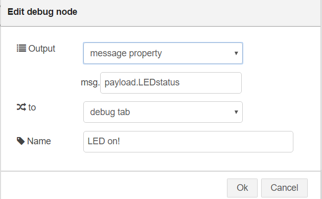 Finally make two DEBUG output nodes and wire them with the SWITCH node. Complete the “msg” by adding “payload.LEDstatus”. If the flow reaches the DEBUG nodes you will see a message in the debug slider on the right.
