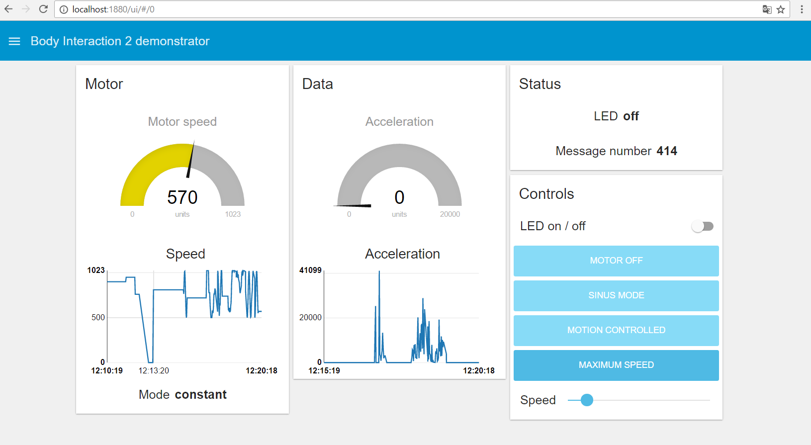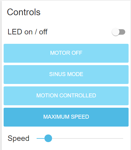 The window above is called a tab. You can have multiple tabs. The Motor, Data, Status and Controls – windows are called groups. The Controls – group has buttons to set the motor mode. In addition there is a slider which will set the motor to a constant speed. And there is an on/off button for the LED.