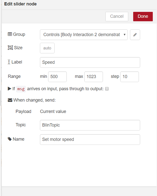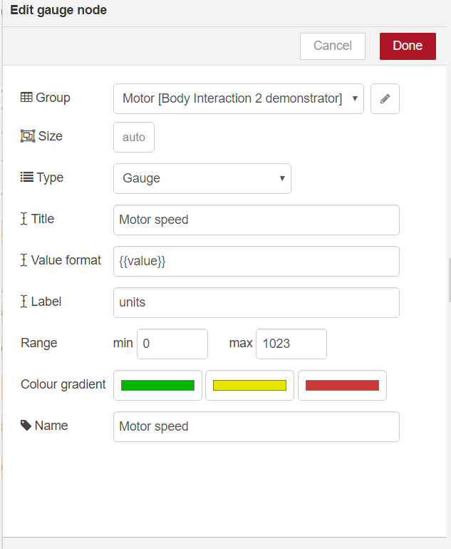 To display the speed we need to more nodes. The gauge node gauge-node displays the actual speed. Connect the gauge node with the function node. You can add the range – the minimum and maximum value (0 and 1023).motor-gauge